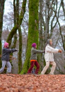 - La deuxième phase, en position debout, est un temps d’entrée dans le mouvement avec quelques mouvements de Qi Gong de manière à commencer la mobilisation du corps et la prise de conscience de la respiration dans le mouvement.
